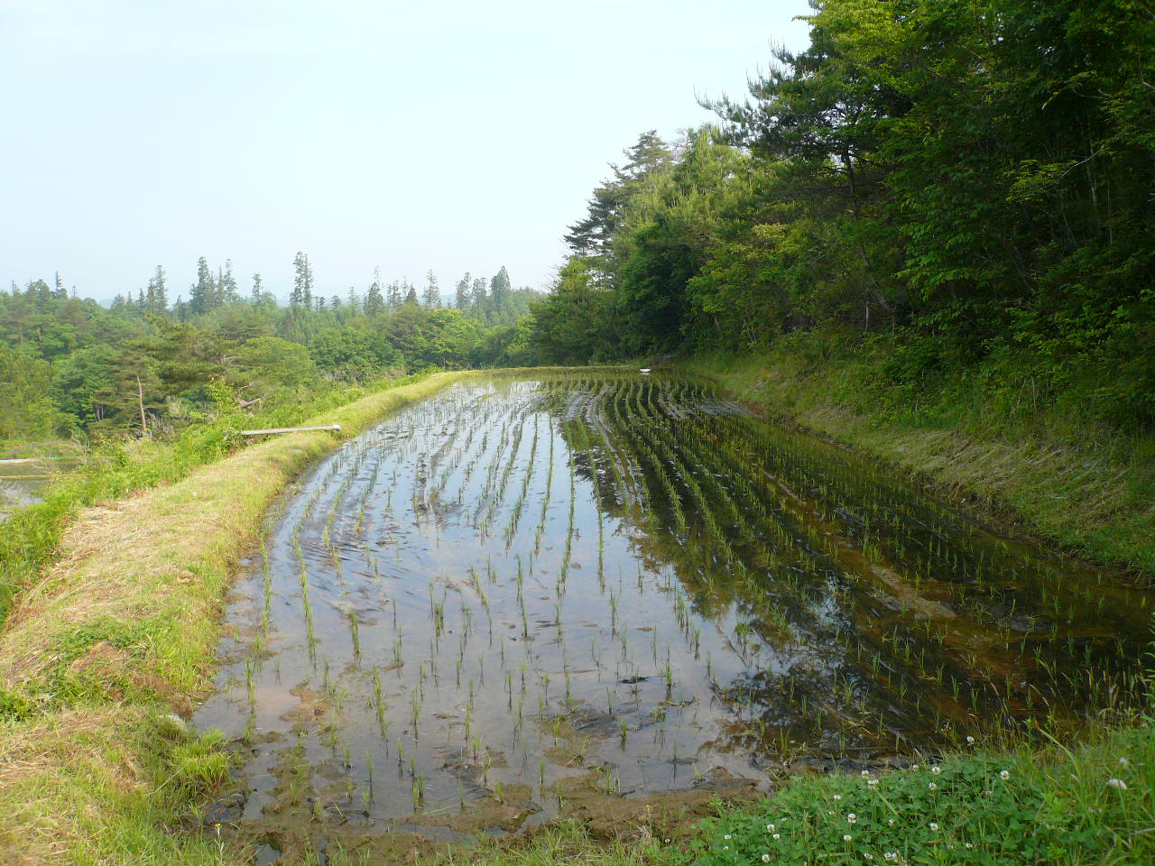↑ 朝、連れて行ってもらった山奥の田んぼ。 黒いビニールシートがかぶせてあります。 雑草対策だとか。
