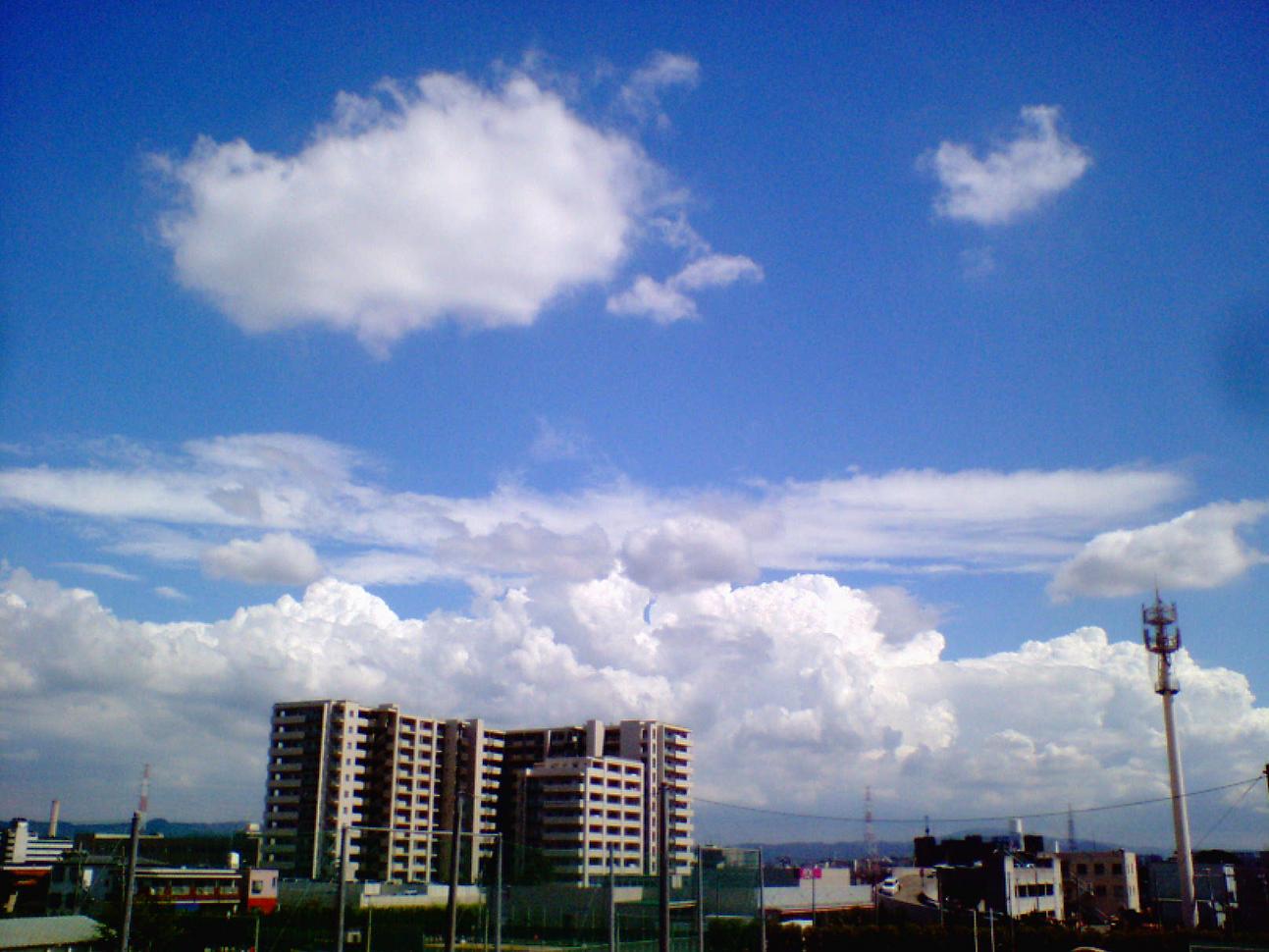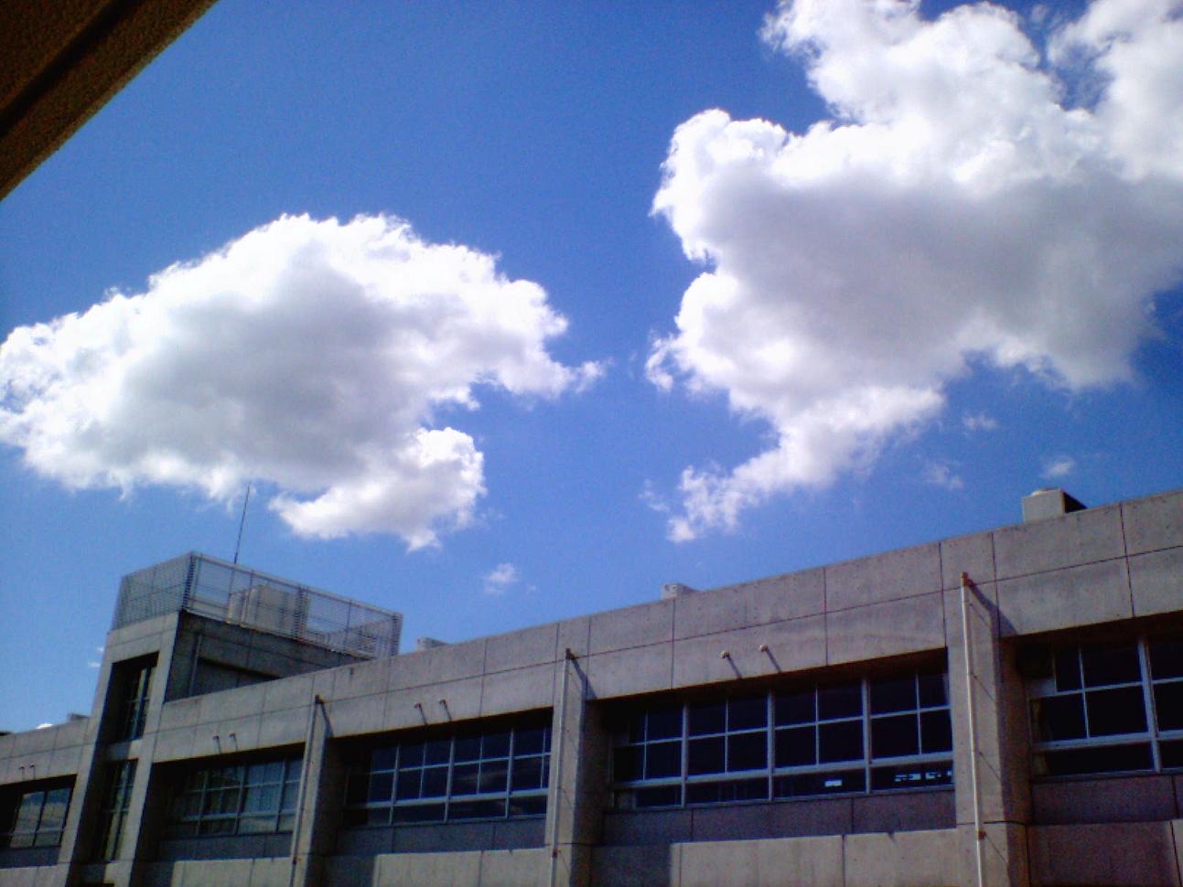 ↑ 抜けるような青色に、立体的な曇。下には校舎が。