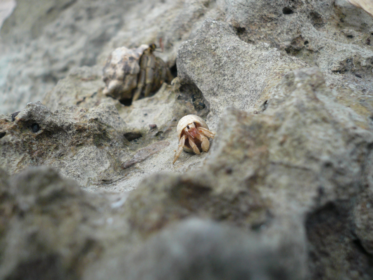 ↑ オカヤドカリ発見! けっこう小型の個体も大型の個体もいました。コンクリートで岸壁が作られてるのに、よくがんばってるなぁ…。
