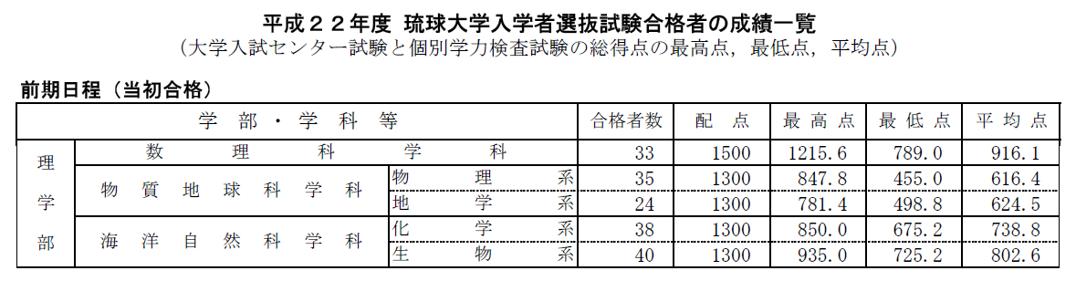 ↑ 今年の入学者の成績情報。琉大公式ホームページより抜粋。