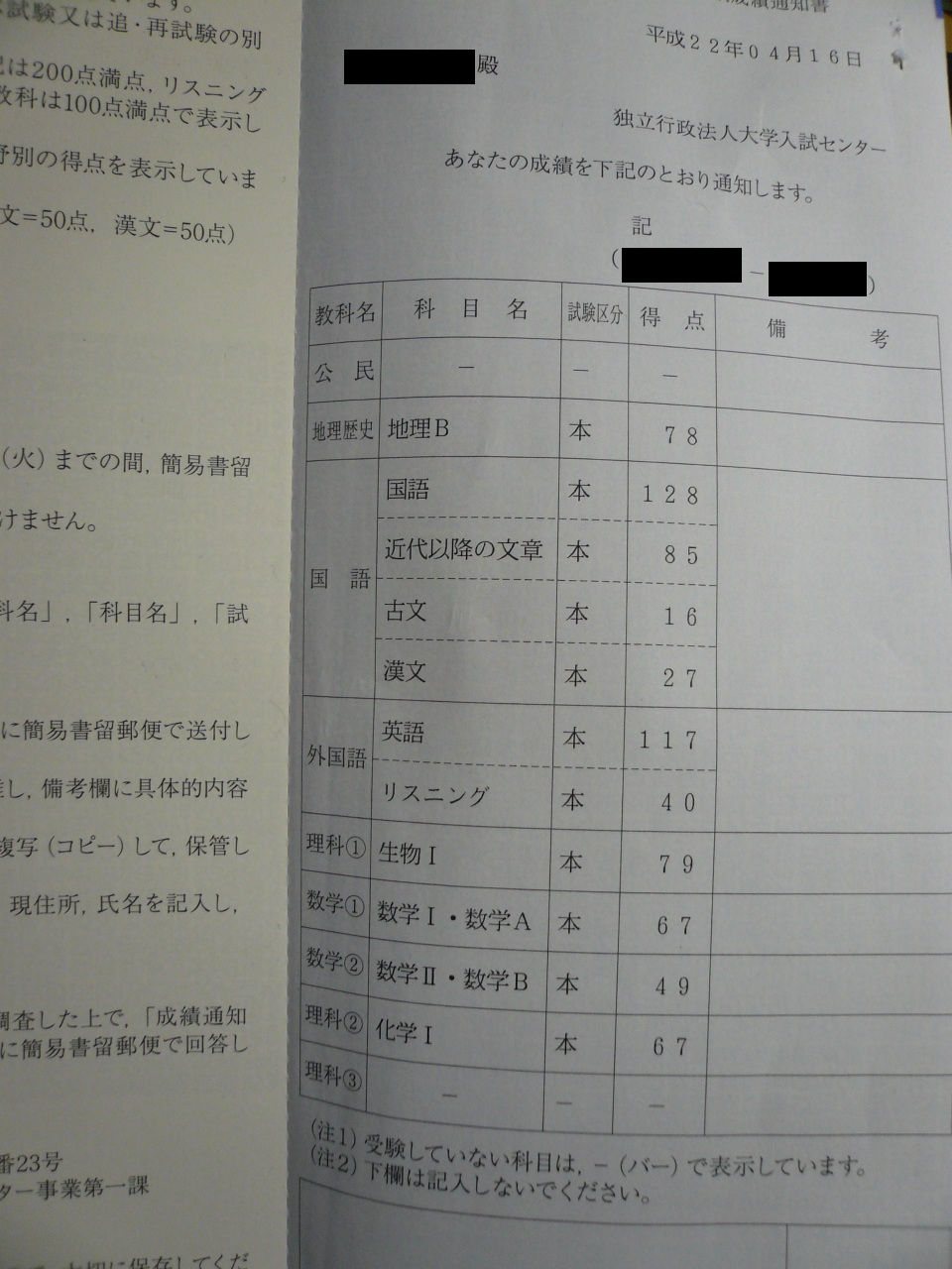 実は、ちょっと前に実家から「センター試験の結果開示票が来た」という情報を聞いてました。