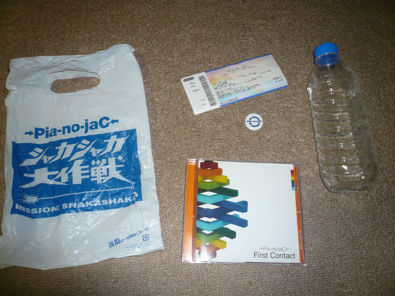 ↑ 獲得品?「シャカシャカ大作戦」の袋は、曲中にシャカシャカ鳴らしたり。最後は空気を詰めて、パンッと割られましたとさ。 ミネラルウォーターは、終わり間際、ピアノ担当のハヤトさんが客席に向けて投げたものをゲット。…別にサインが書いたりしてあるわけでもなく…。