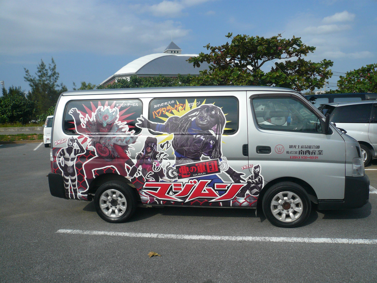 ↑ そこの駐車場で発見。沖縄のローカルヒーロー「琉神マブヤー」の敵である「悪の軍団マジムン」(マジムンはうちなーぐちで「魔物」の意)のペインティングカーですね。……ハブデービルがいないなんて…。