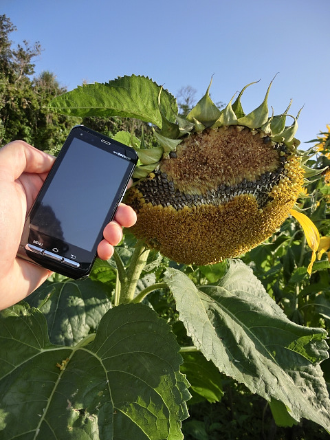 ↑ かなり大きいものもありました。枯れかけてますけど。手に持っているのはディスプレイサイズが3.7インチの、マイ・ケータイF-12C。