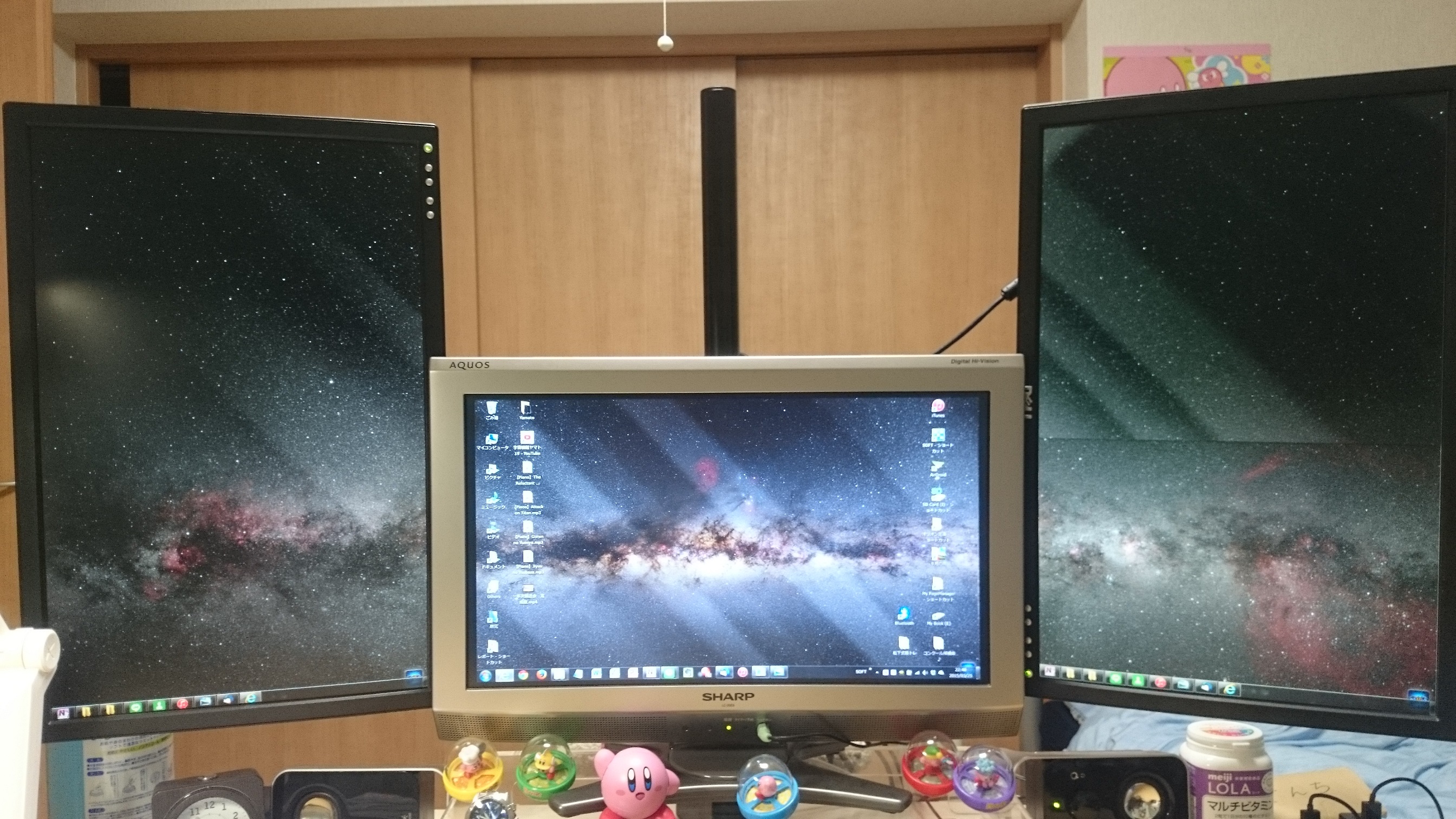 ↑ これまたお下がりでもらったモニター2枚とモニターアームで。母艦はノートPCで2画面同時出力までしか対応していないので、左側はUSB-VGAアダプターを買い足して表示させました