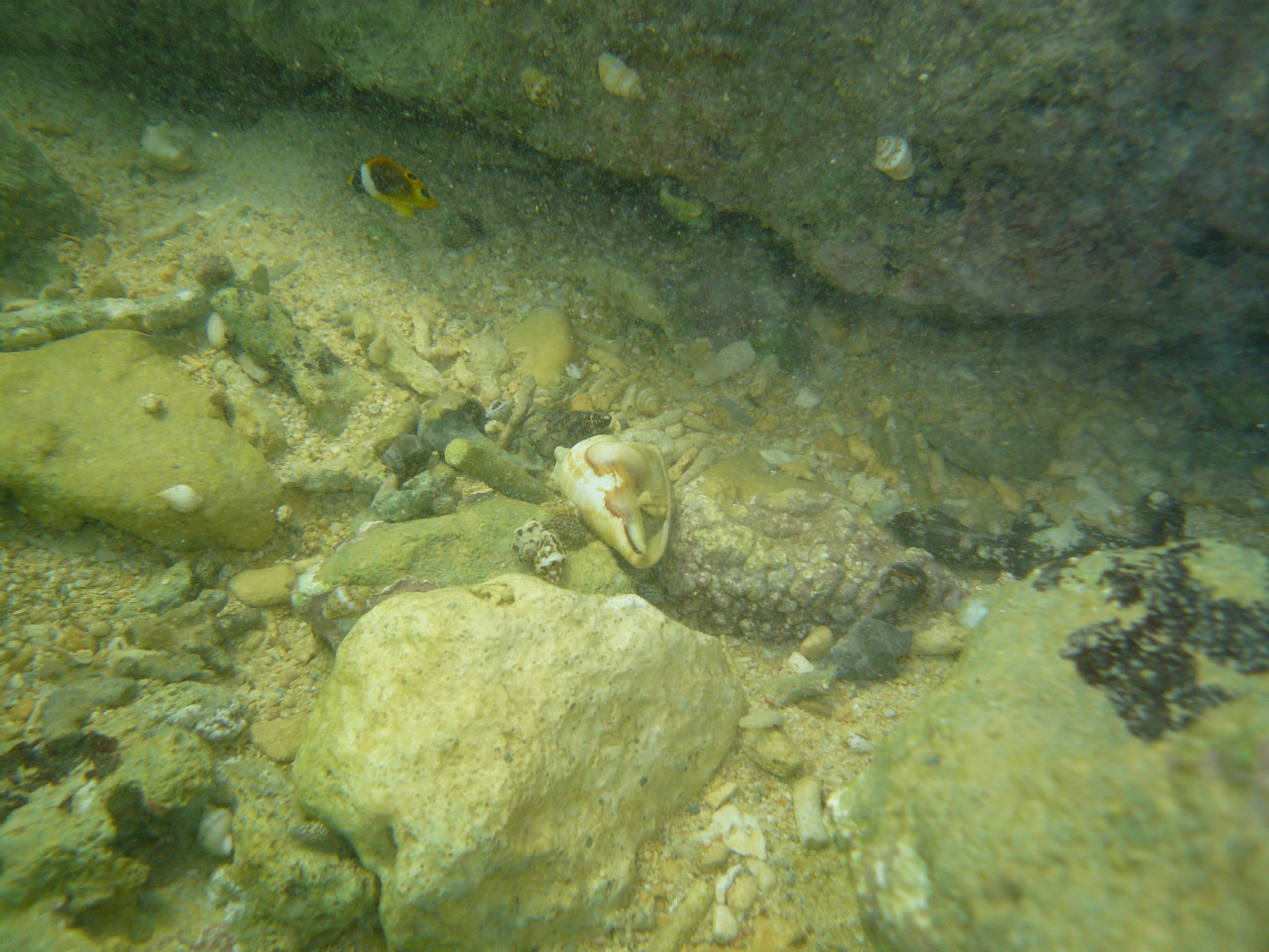 台風が行った後なせいか、潮が満ちていたせいか、もともとそういう場所なのかは分かりませんが、波がそこそこ強く、水中の視界はかなり悪かったです。…なんてこったい。