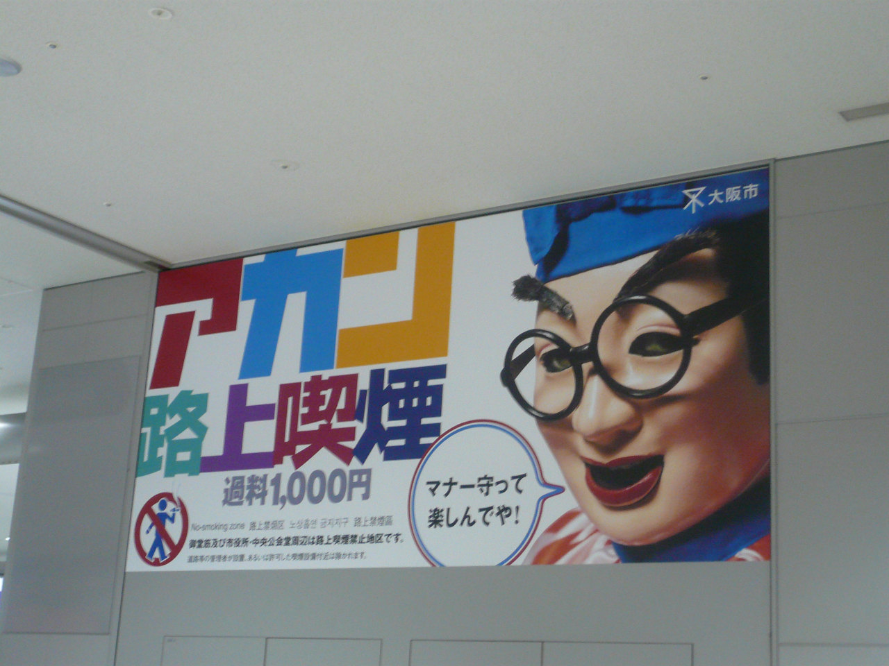 ↑ 関空にて。おぉ、「食い倒れ人形」だ。ポスターにも出演かぁ。路上喫煙は全面廃止してもらいたいものです。