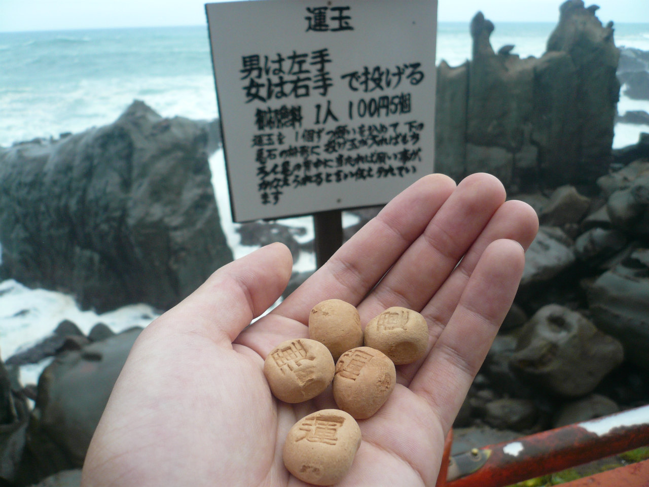 ↑ 「亀石」(写真中央)の背中に投げ当てると。…がしかし、周りの人たちが皆「背中のくぼみに入れる」ことを狙っていたので、自分も。