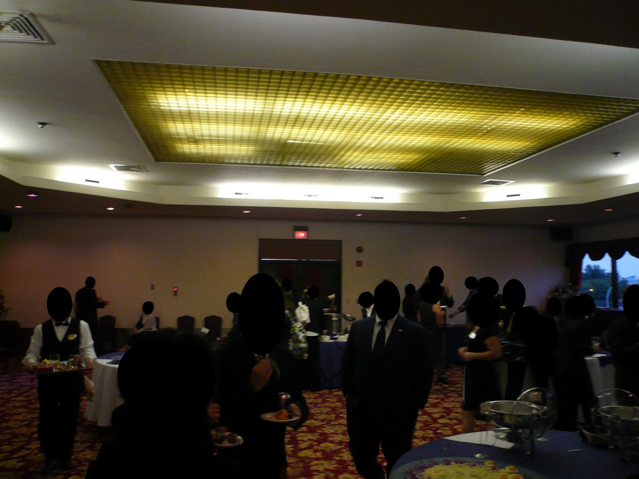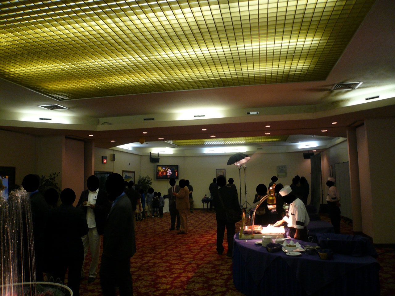 ↑ パーティ会場にて。皿を持って徘徊、欲しい物を取るバイキング形式(?)でした。