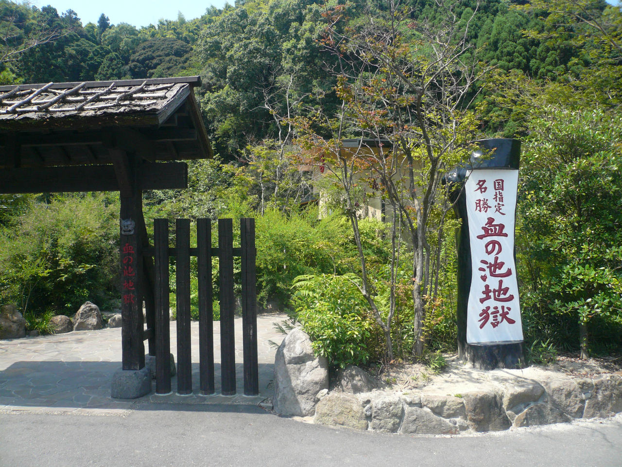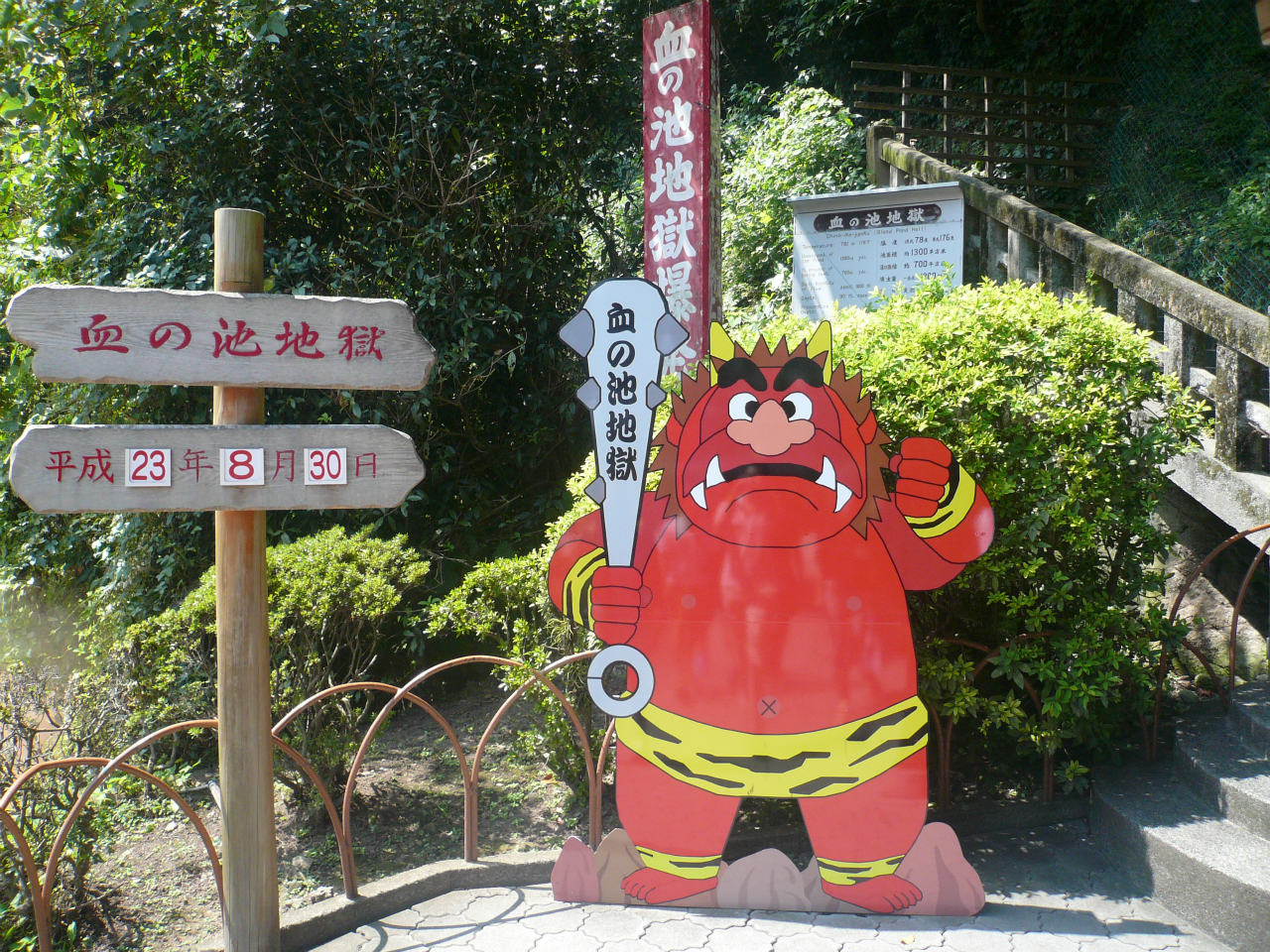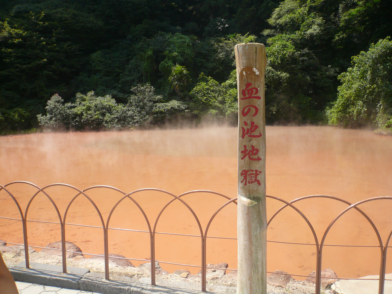 ↑ 血の池地獄。 赤い色は酸化鉄によるものらしいです。 この泥は皮膚に良いとかで、軟膏も売られていました。